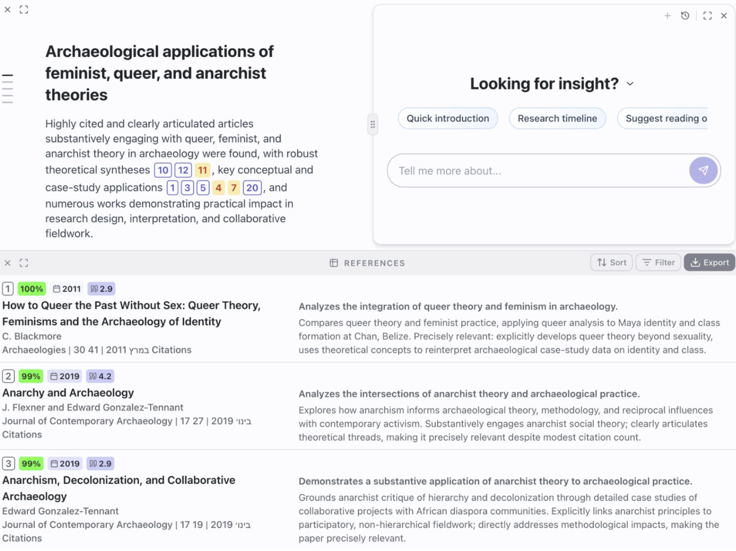What you'll see: Type your research question into Undermind AI and it searches academic databases to create comprehensive reports. For example, we searched "feminist archaeology methods" or "anarchist approaches in fieldwork" and got organized summaries of key papers, influential scholars, research timelines, and citation networks.